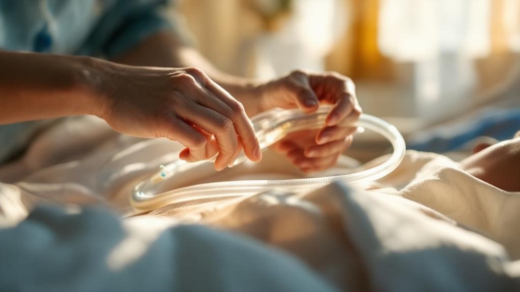 Maintaining your feeding tube’s cleanliness directly impacts infection prevention and tube longevity. Implementing proper tube maintenance protocols safeguards your loved one’s health during this critical shift period.